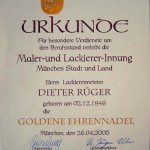 Dieter Rüger, Geschäftsführer, erhielt bereits 1999 eine Ehrenurkunde und 2005 die goldene Ehrennadel der Maler- und Lackierer-Innung München Stadt und Land. Die Auto Rüger GmbH ist seit 2010 nach DIN EN ISO 9001:2008 zertifiziert. Mehr Info über unsere Qualitätsmanagement – Zertifizierung.